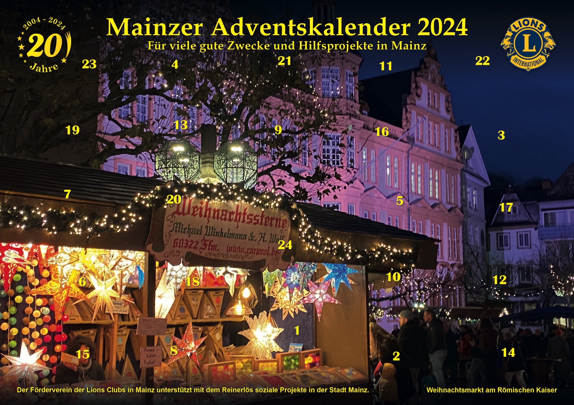 Die Ausspielungs-Bedingungen der Lotterie "Mainzer Advents-Kalender 2025" lauten: Die Ausspielung umfasst 10.500 Kalender. Der Verkaufspreis des Kalenders beträgt 5,00 €. Der Verkauf an Minderjährige ist nicht gestattet. Jeder Kalender gilt als Los mit einer individuellen Gewinn-Nummer, die rechts oben auf der Vorderseite steht. Bei den Gewinnen handelt es sich um Sachpreise und Gutscheine. Der Umtausch von Sachpreisen und Gutscheinen in Geldbeträge ist ausgeschlossen. Umfang, Ausführung und Qualität der Preise richten sich nach den Festlegungen der Sponsoren. Die Gewinne und Gutscheine sollen bitte unter Vorlage des Kalenders mit der ausgelosten Gewinnnummer bis zum 31.03.2026 an den angegebenen Anlaufstellen abgeholt werden. Wenn Sie den Förderverein der Lions Clubs in Mainz zusätzlich in dieser Sache unterstützen möchten, bitten wir um Ihre Spende unter dem Stichwort "Spende Lions-Kalender" auf unser Konto bei der Volksbank Darmstadt Mainz, IBAN DE83 5519 0000 0338 8520 15. Sie erhalten bei Beträgen ab 300,- € automatisch eine Spendenquittung. Bis 300,00 € gilt Ihr Bankkonto-Auszug als Spendenbeleg. Förderverein der Lions Clubs in Mainz: Heiner Troßbach, 55130 Mainz, mainzer-adventskalender@web.de |